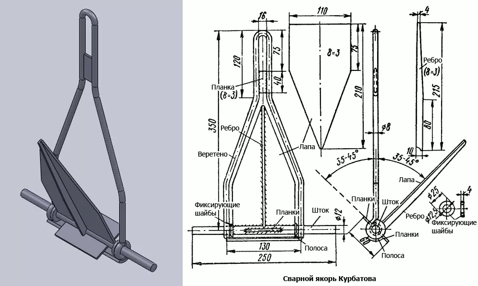 - Различающиеся по размерам металлические пластины набираются на болт с приваренным кольцом для каната. Самая маленькая пластина должна располагаться снизу. Якорь Курбатовский