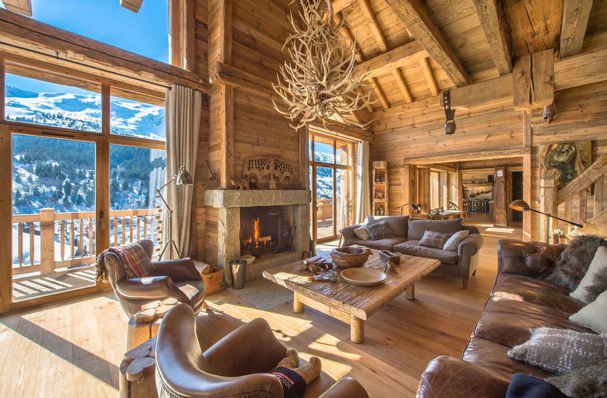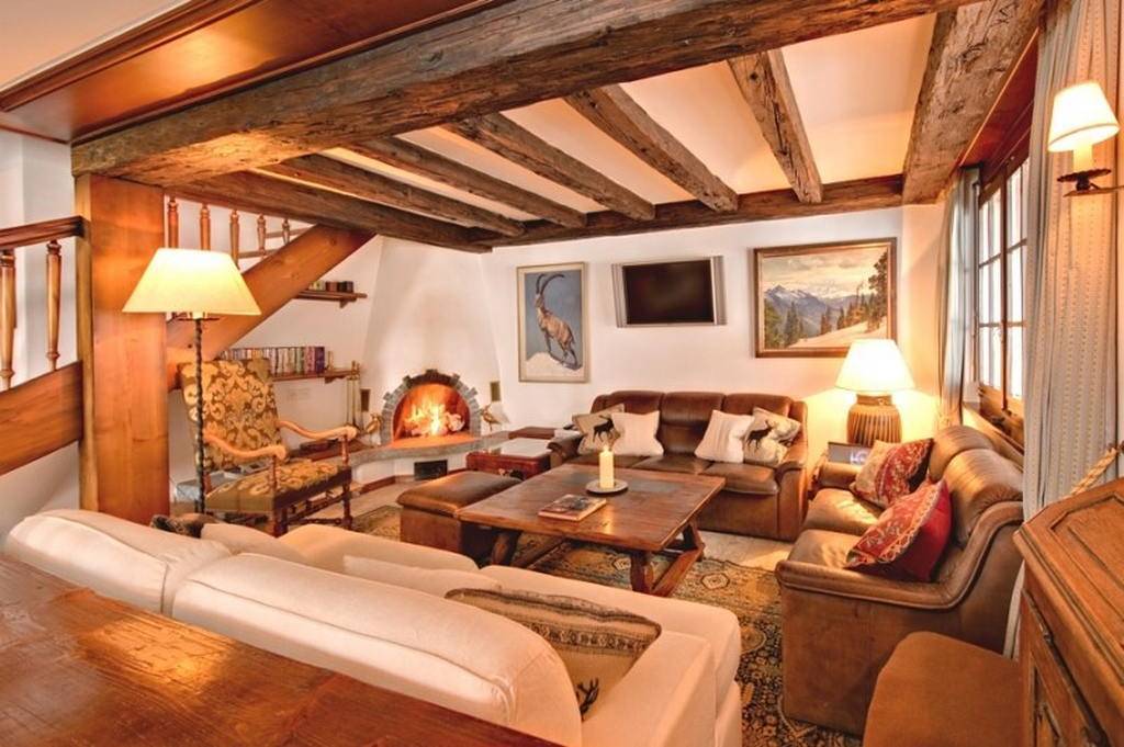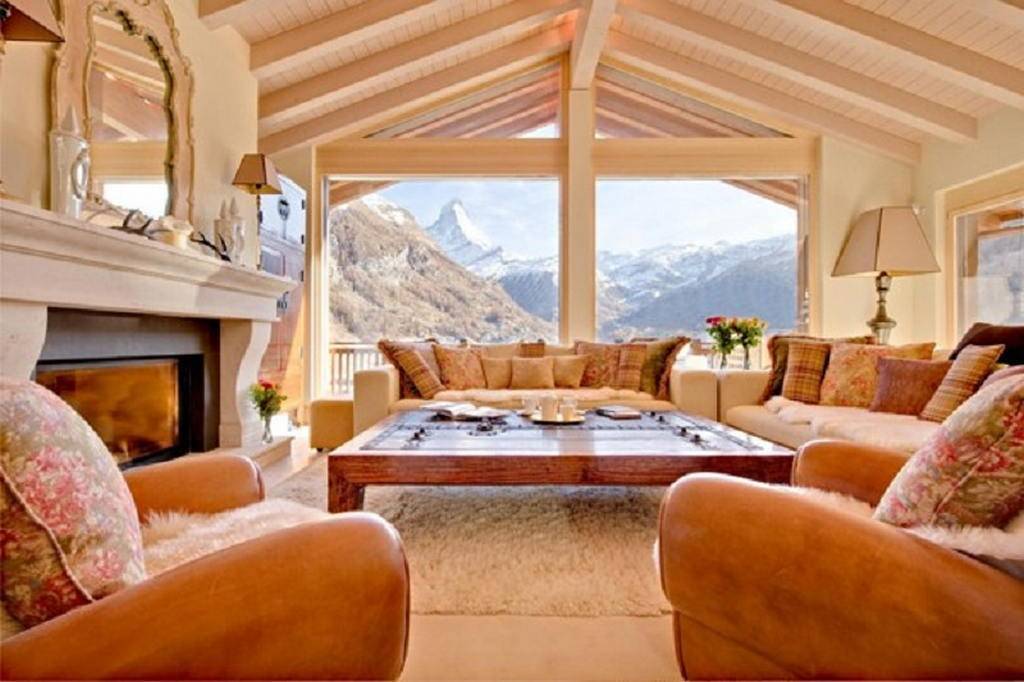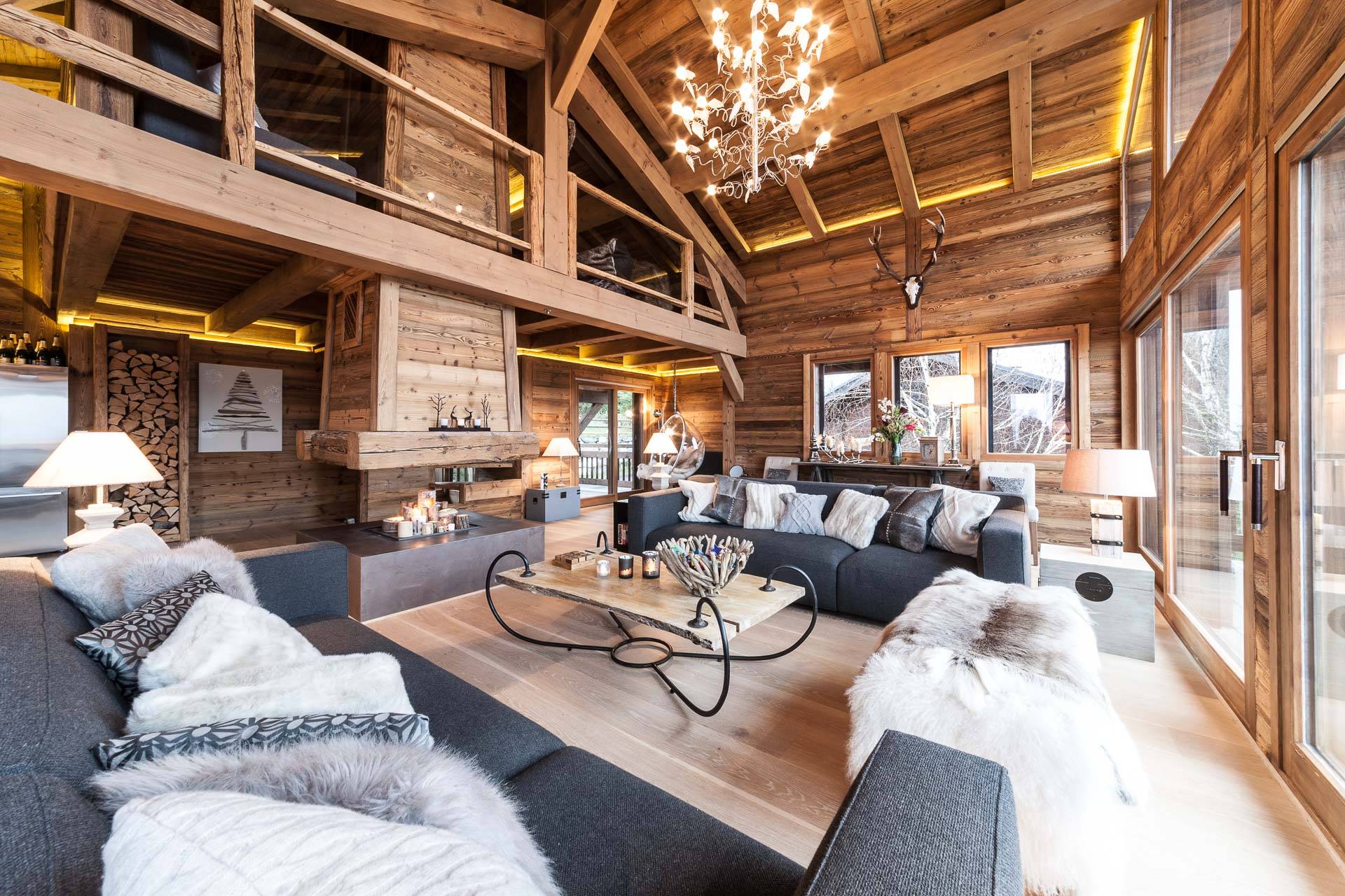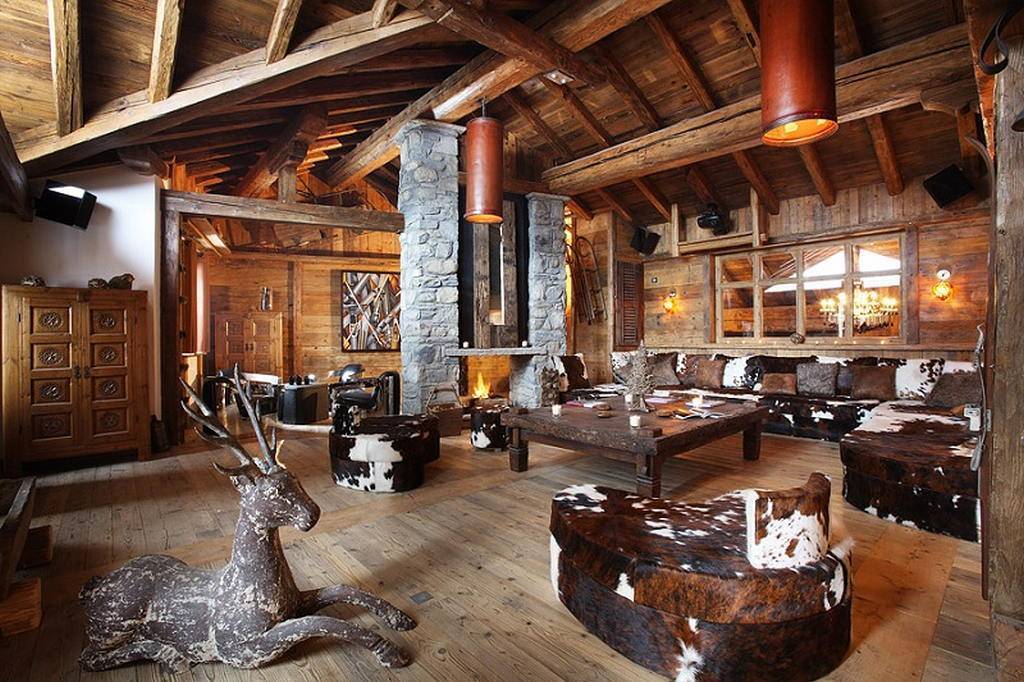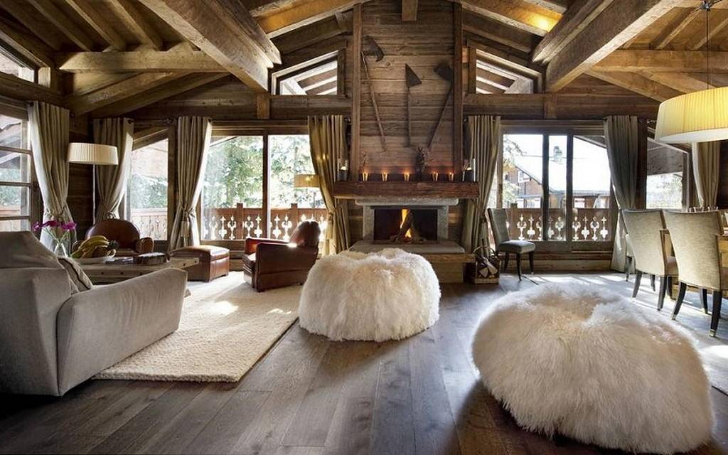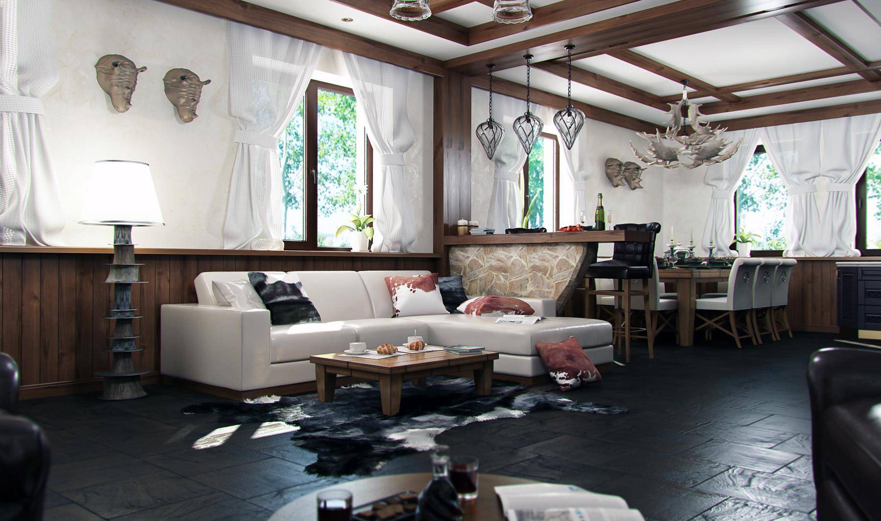 Интерьер дома в стиле шале начинается с обустройства гостиной, ведь это самая большая комната, в которой высоченные потолки и большие во всю стену окна. Главное здесь использовать только натуральные отделочные материалы без замены на аналоги.