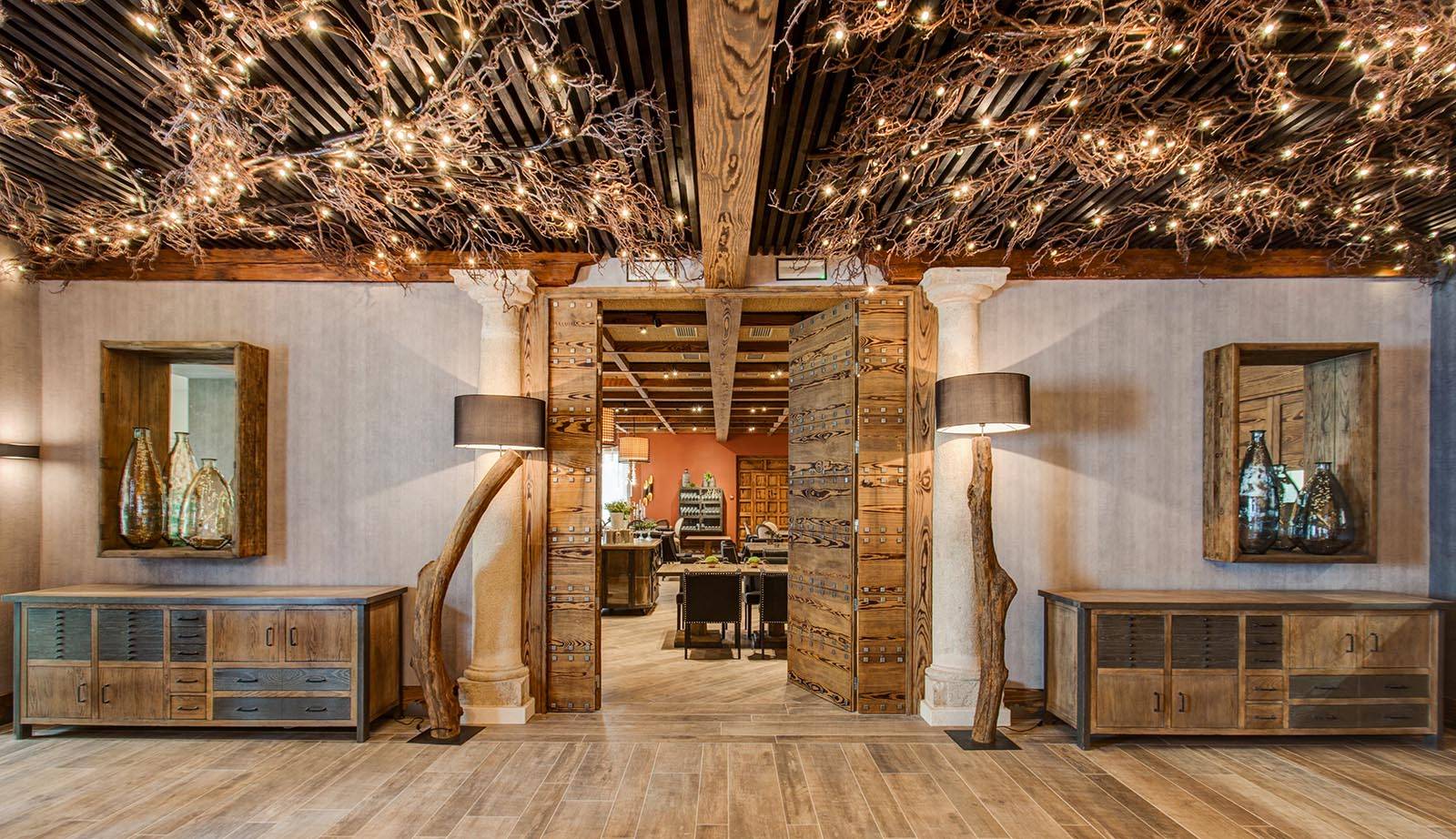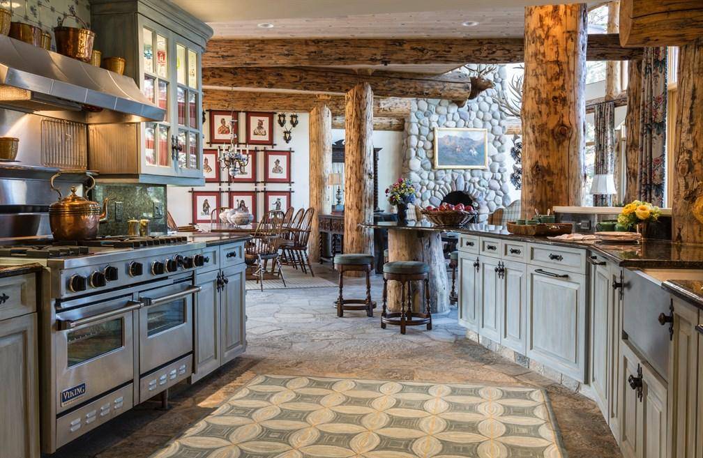 Большие гобелены, холсты классической художественной школы в деревянных рамках с изображением природы, животных и сцен охоты завораживают взгляд. Охотничье оружие, развешенное на стенах, помогает придать интерьеру своеобразный колорит. В фермерском прочтении стиля можно встретить прикрепленные к стене орудия труда.