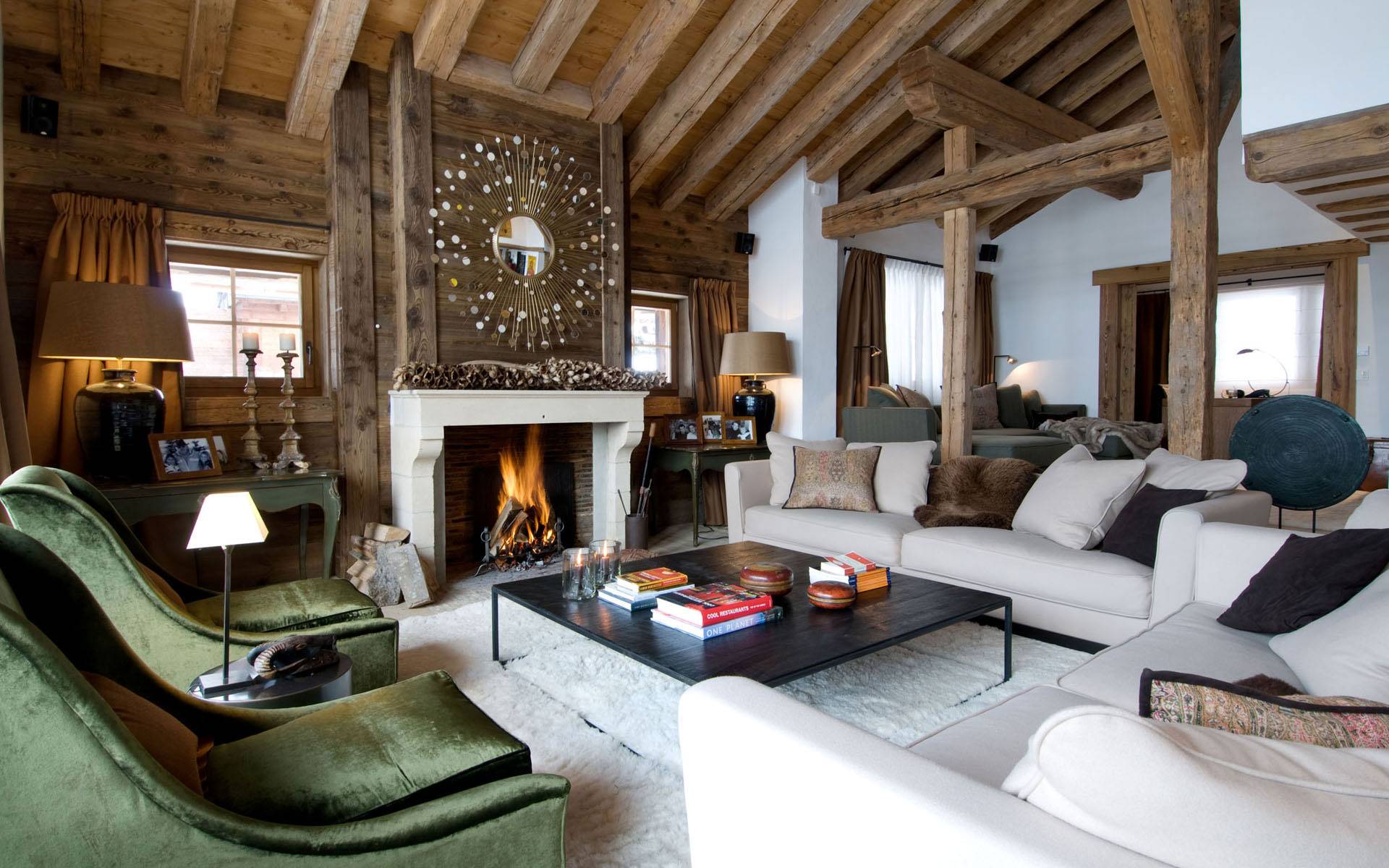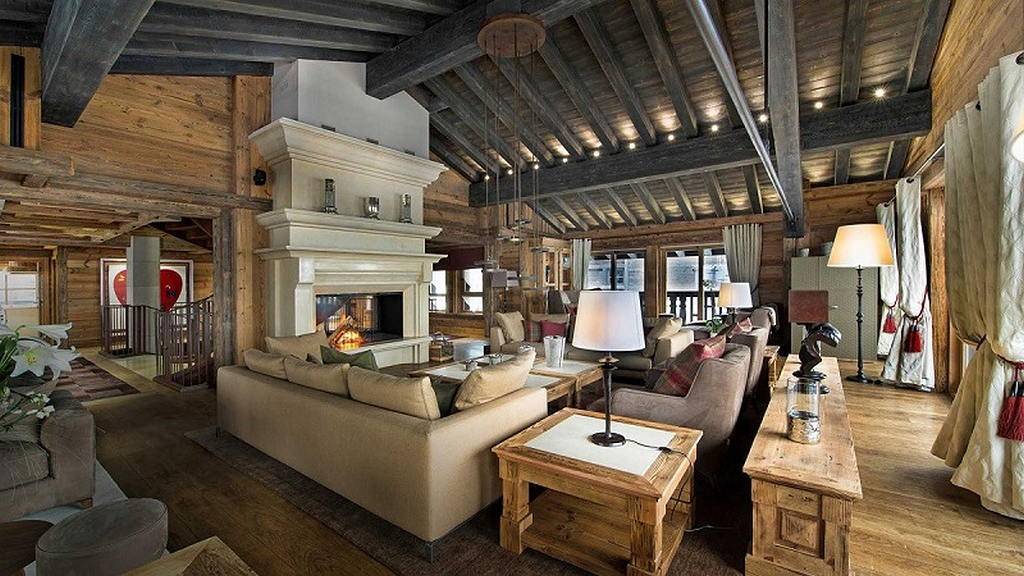 В интерьерах используются простые геометрические формы, без сложных асимметричных конструкций и витиеватых элементов. Стилистика шале скорее напоминает смесь деревенского и классического стилей. В гостиной обязательно устанавливают камин, желательно – большой и настоящий.
