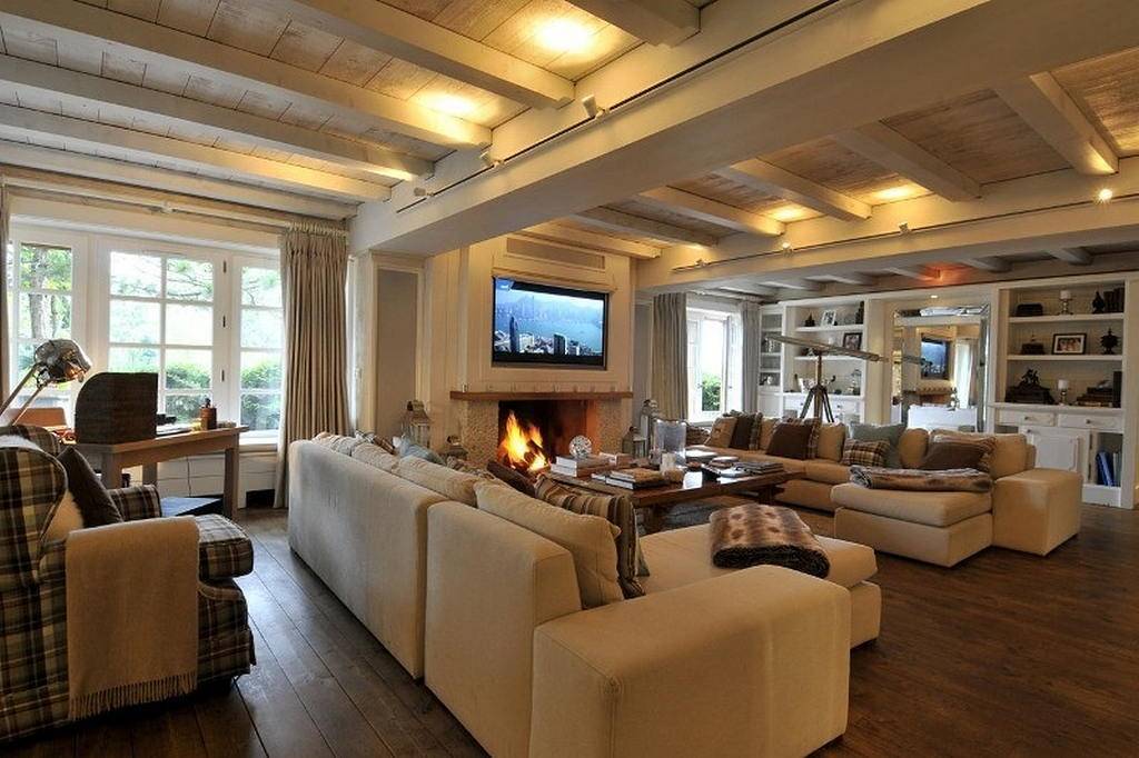 Камин — визитная карточка стиля, место фокусировки интерьера. Он устанавливается в гостиной, а то и в спальне, облицовывается камнем. Встречаются электрические камины, над которыми вполне естественно выглядят плазменные телевизоры.