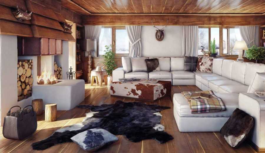 Для интерьера шале подойдет просторная комната с высокими потолками и панорамными окнами. Шкуры животных, массивная мебель и теплые ковры подчеркнут очарование стиля. Освещение может быть многоуровневым. Центральная люстра под старину (с имитацией свечей) будет создавать уют вместе с бра, настольными или напольными лампами с абажурами из натуральной ткани. Пример интерьера дома в стиле шале, фото просторной гостиной: