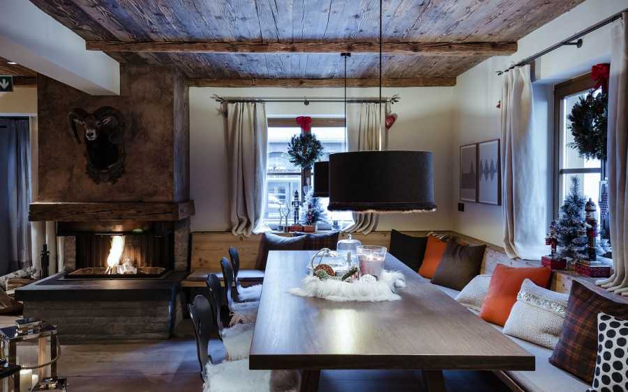 Камин играет доминирующую роль во внутренней обстановке шале, поэтому его оформлению уделяется особое внимание. Подходящим украшением для него будет гирлянда, состаренные подсвечники и статуэтки