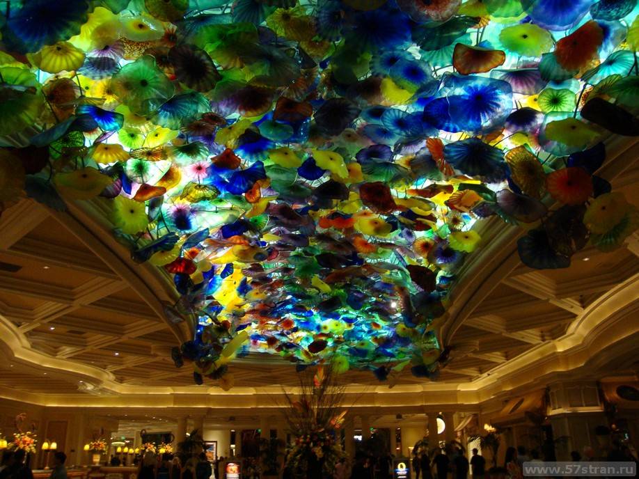 Внутри Белладжио тоже есть на что посмотреть. Кроме пафосного интерьера и люстры «озеро Комо» за миллион долларов от скульптора Dale Chihuly: