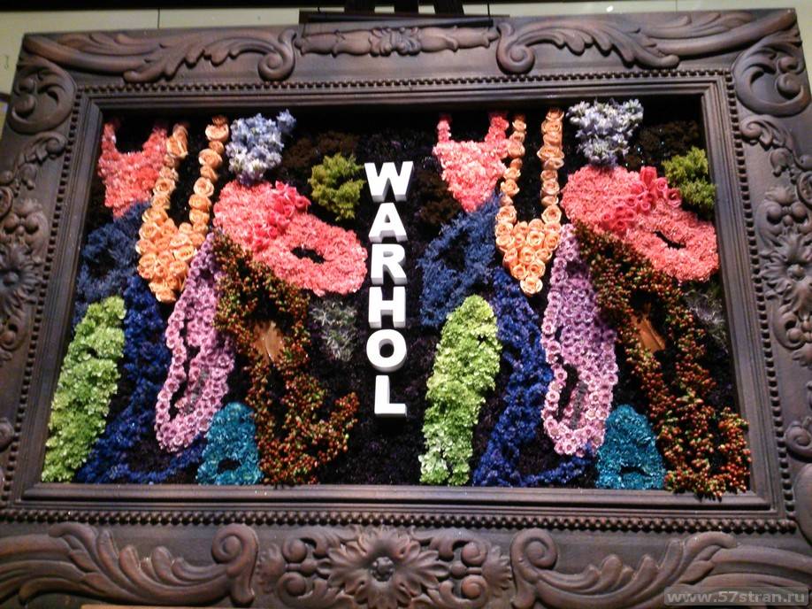 В левом дальнем углу от входа обычно выставляется одна из феноменальных цветочных репродукций картины Andy Warhol