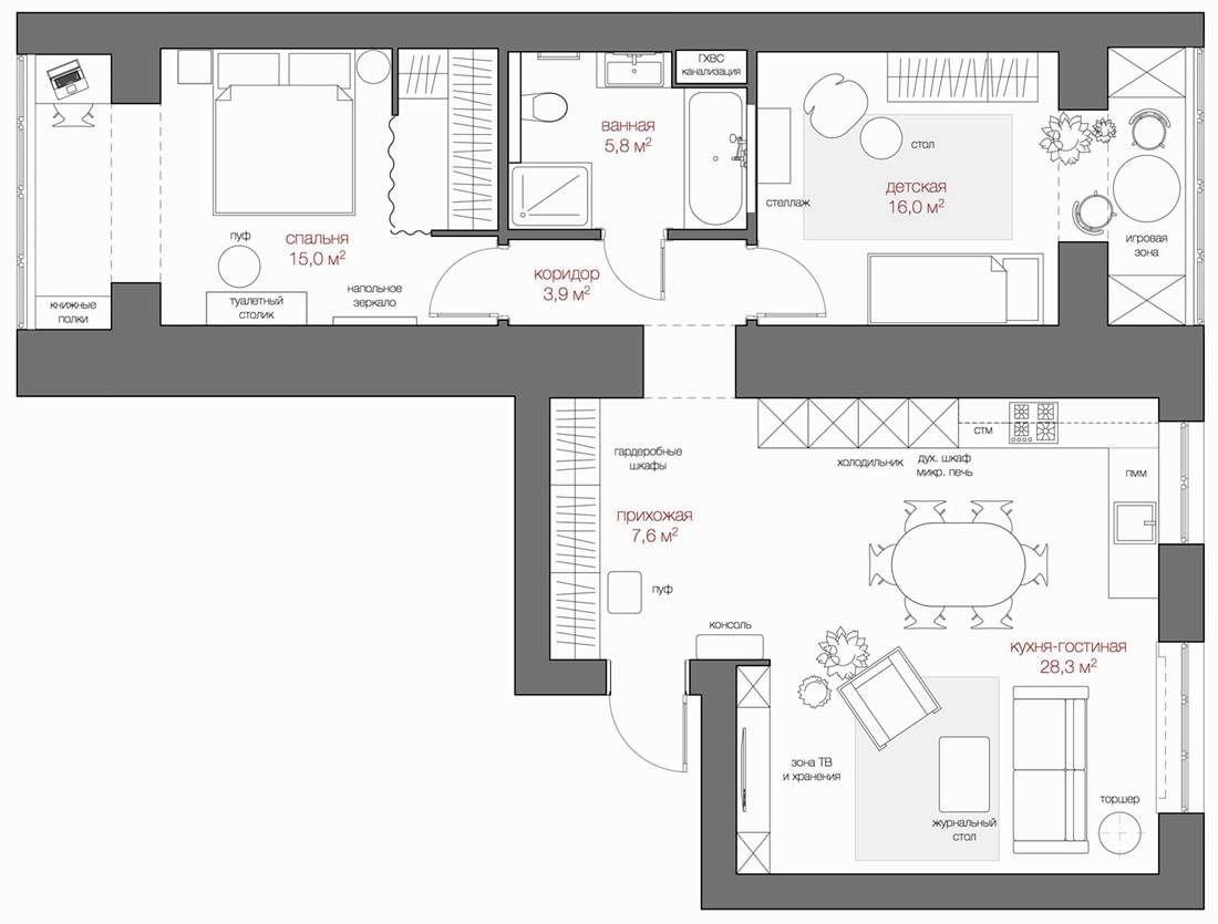 В этом варианте перепланировки, кухню (8 кв. метров), гостиную (20 кв. метров) и прихожую (7,6 кв. метра) объединили в одну комнату, которая получилась очень просторной и с двумя окнами.В детской и спальне лоджии присоединены, там образовались кабинет и игровая комната.Ванная комната расширена за счет одной из спален, теперь здесь есть и ванная чаша, и душевая кабина.Кухонный гарнитур поставлен таким образом, чтобы раковина находилась напротив окна, что очень удобно, а зона для ТВ встроена в нишу.