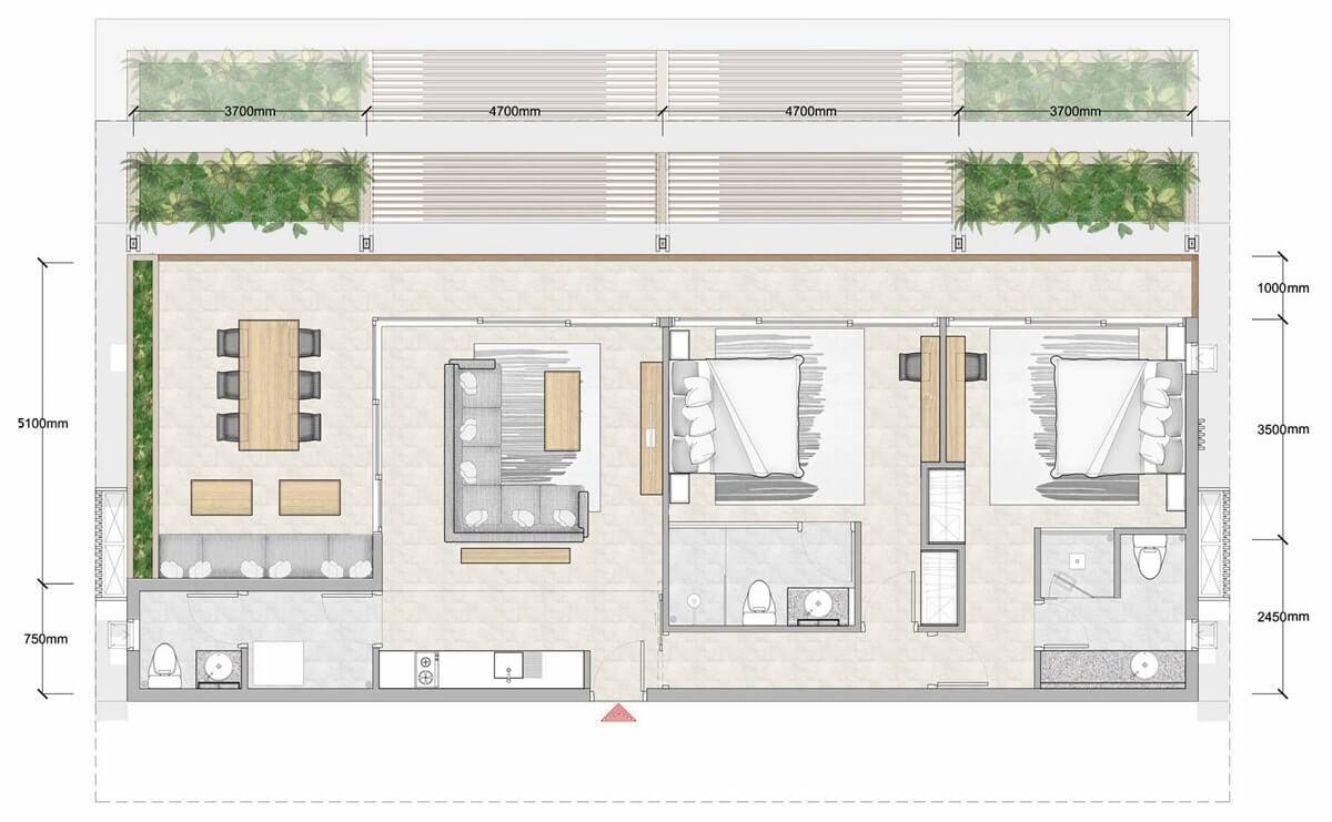 Эта практичная планировка трехкомнатной квартиры площадью 110 квадратных метров имеет две спальни, в каждой из которых есть ванная комната и гардеробная. Кухня не имеет окна, но спроектирована в американском стиле – с островом и столовой на четыре персоны. В гостиной двери на балкон решены в формате дверей-слайдеров со стеклами от пола до потолка.