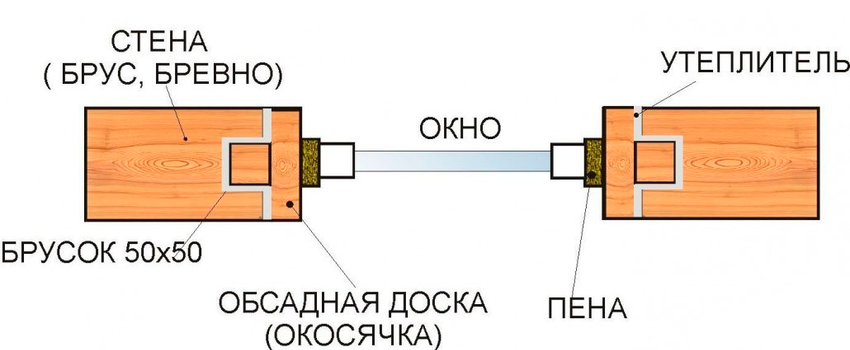 При установке необходимо следить за тем, чтобы монтажная пена не соединяла обсадку со стеной. В ином случае, обсадная конструкция не сможет опускаться вместе с усадкой дома.