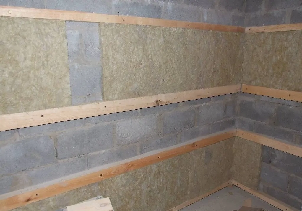 - К стене необходимо прибить деревянную обрешетку, между которой нужно уложить утеплитель, можно использовать минеральную воду.