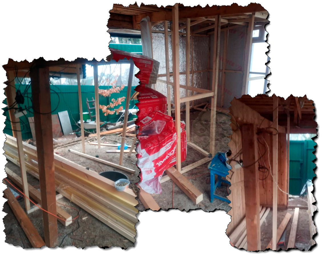 Есть пол – нужны стены. Не мудрствуя лукаво основа – брус. Между брусом утеплитель. Снаружи доски, внутри вагонка.