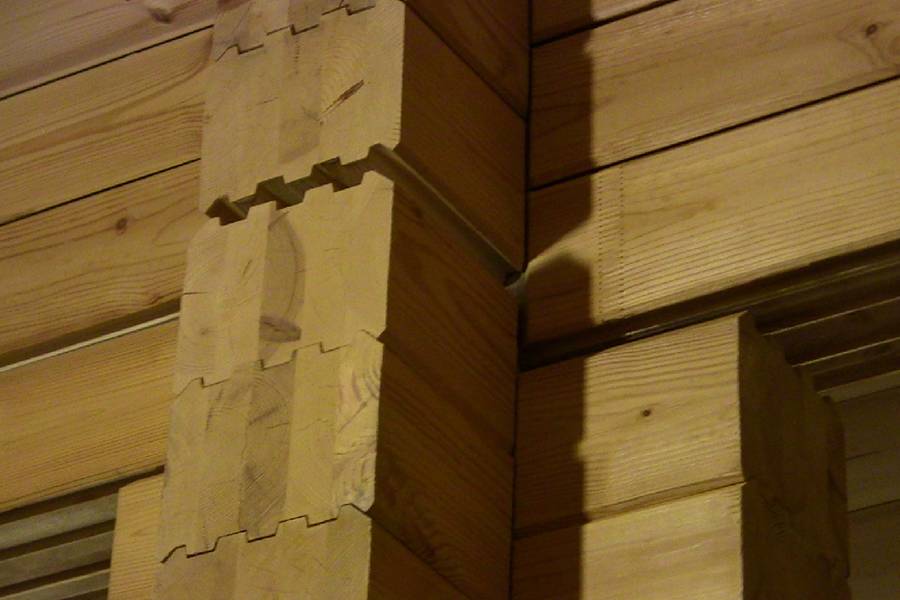 Далее начинается сборка боковых плоскостей с использованием джутового уплотнителя, располагающегося между рядами. Угловое соединение осуществляется встык, на коренных шипах, на шпонках или в виде ласточкиного хвоста. Последний вариант требует определенной сноровки.
