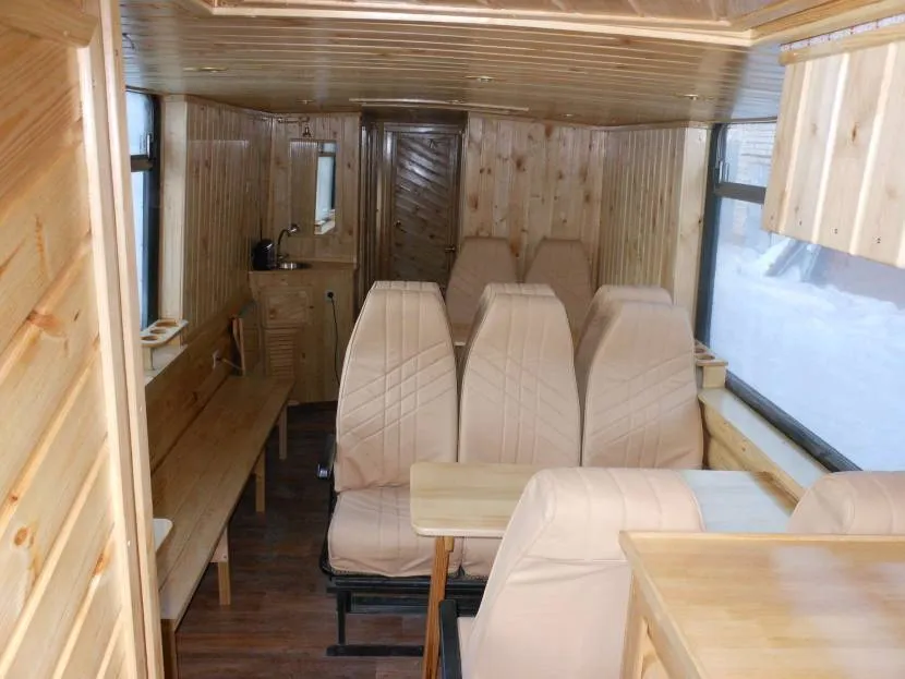 Просто на легковом прицепе можно возвести комфортную парную только на пару человек. А вот остальные три вида позволяют организовать просторное помещение, которое может вместить и до 10 человек. А легче всего переоборудовать автобус. Например, встроить баню на колесах в ПАЗ. Это очень распространенный вариант. Для этого нужно только утеплить и отделать салон.