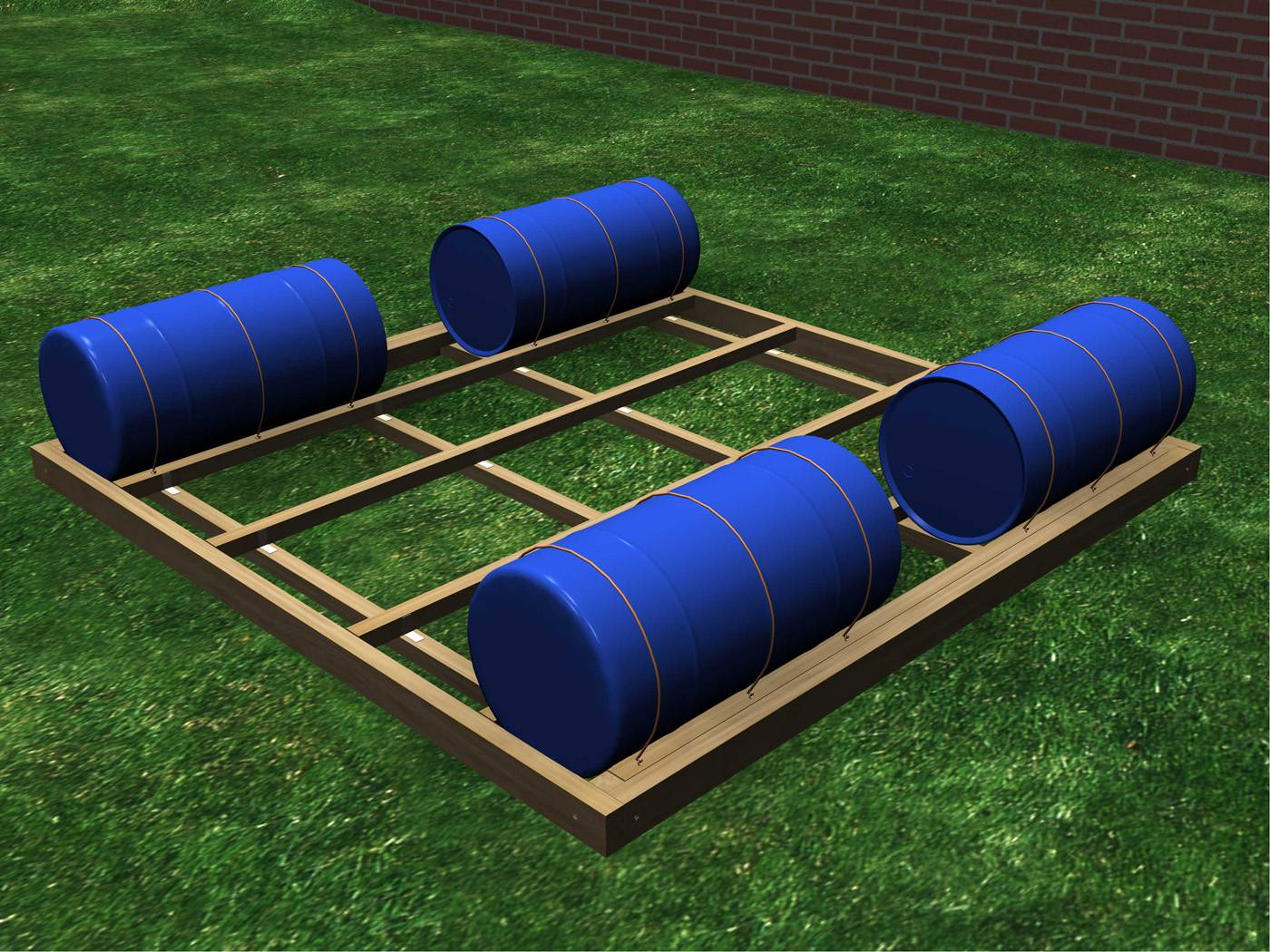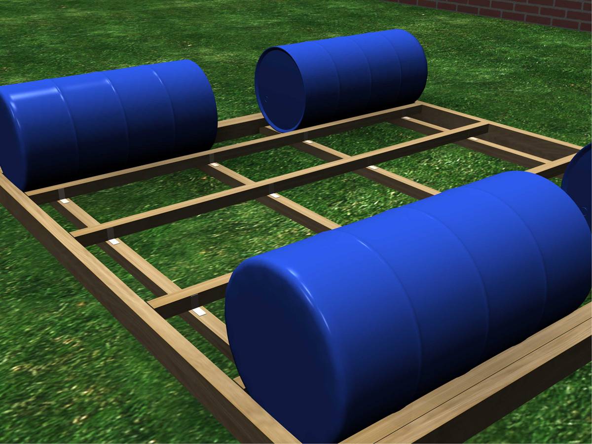 Важно! Как уже упоминалось раннее, использование в качестве основы понтона ПВХ изделий повышает срок службы. Однако допускается использовать и металлические бочки, но в этом случае их следует хорошенько прогрунтовать и прокрасить антикоррозийной водостойкой краской.. Сборку понтона следует производить как можно ближе к воде, на самом берегу, чтобы, когда причал будет готов, не возникло проблем с перетаскиванием готового понтона в воду.