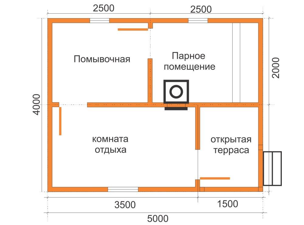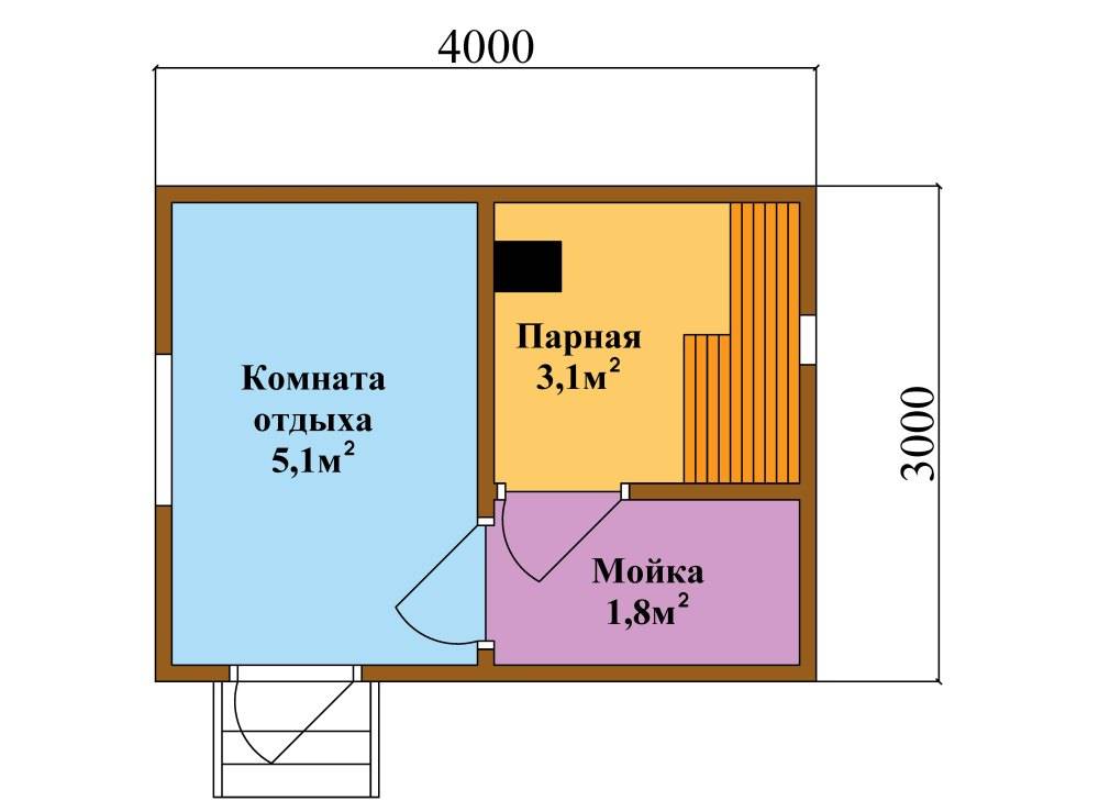 Мини-баня на загородном участке — прекрасный вариант для экономии площади. Правда, одновременно попариться в помещении 3х3 или 3х4 получится лишь у пары человек. Тем не менее, это самый быстрый и недорогой вариант постройки. За основу проще всего взять готовый проект каркасной бани. Можно объединить раздевалку, душевую и парилку в одном помещении. Или предусмотреть более удобный проект с отдельной парилкой, помывочной и комнатой отдыха.