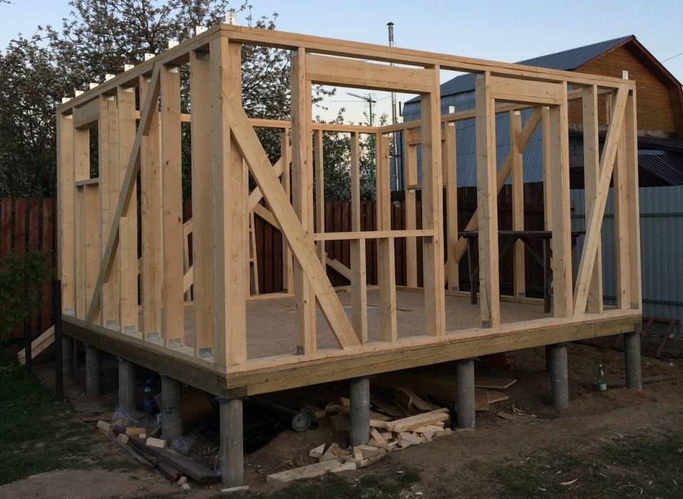 Когда древесина отлежится и хорошо просохнет, начинается подготовка каркасных стоек и деталей стропильной системы для крыши. Проводится разметка мест монтажа каркасных стоек. Окончательная сборка делается так: