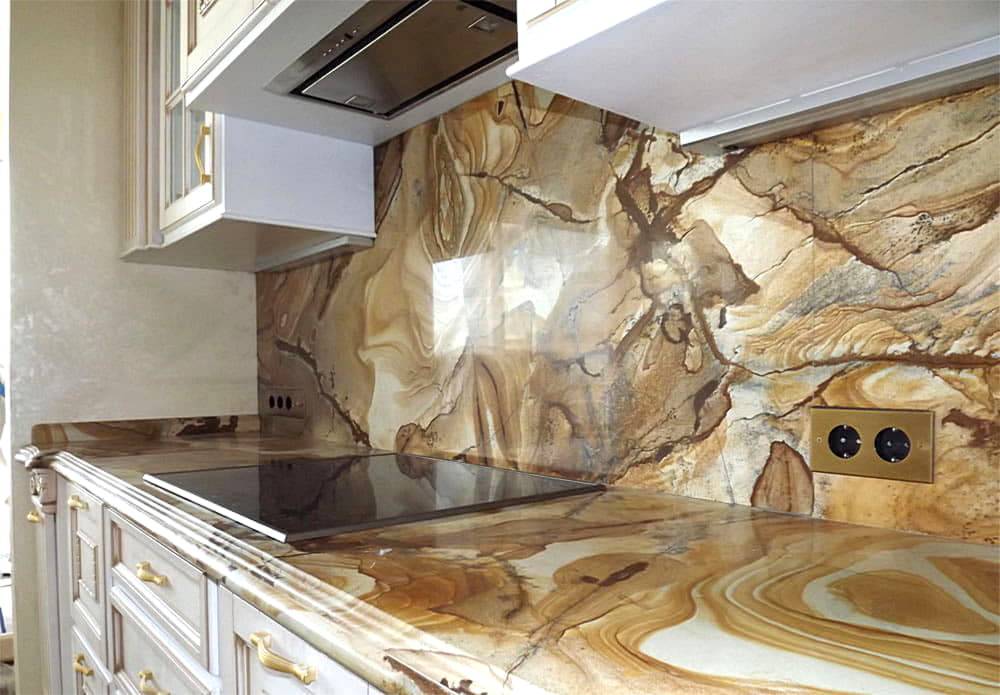Однако, у него существуют определённые особенности – камень хрупок и при случайных ударах могут появляться сколы, помимо этого, камень через время при постоянном контакте с продуктами может изменять цвет, тем более это актуально для материала из светлых оттенков.
