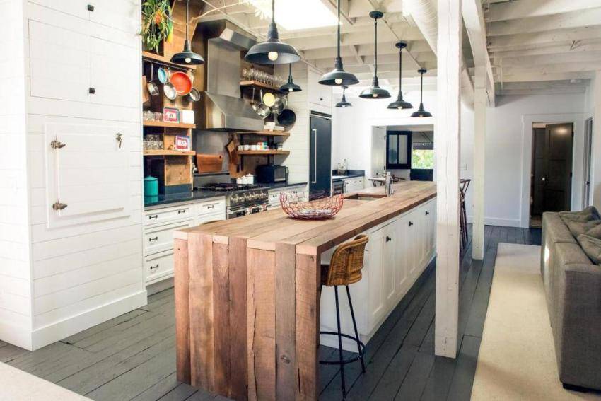 Данное направление в дизайне интерьере объединяет в себе уют и функциональность. На стыке кухни и гостиной можно разместить широкую барную стойку из натурального дерева. Таким образом, получится не только разделить пространство, но и создать дополнительное место для приготовления и принятия пищи.