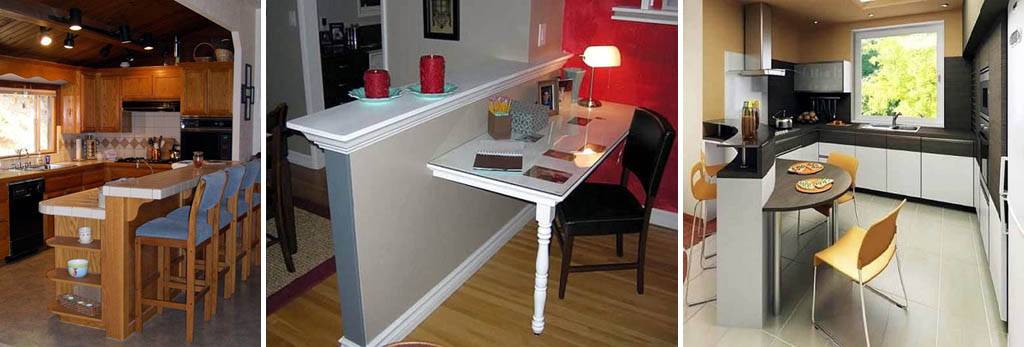 Примыкающие к кухонному гарнитуру, выдвижные и отдельностоящие. Барная стойка может быть продолжением кухонного гарнитура до угловой или П-образной планировки, быть отдельностоящим «островом» или примыкать к стене. Нередко используются выдвижные конструкции – когда барная стойка подвижна, может «прятаться» внутрь гарнитура или поворачиваться вокруг оси.