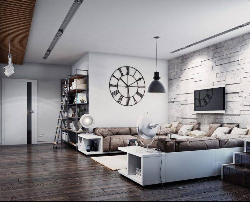 Деревянная мебель или отделка лестницы сделает такой интерьер уютнее и теплее. Древесина, переходящая с пола на стены поможет создать уютную атмосферу в этой части комнаты.