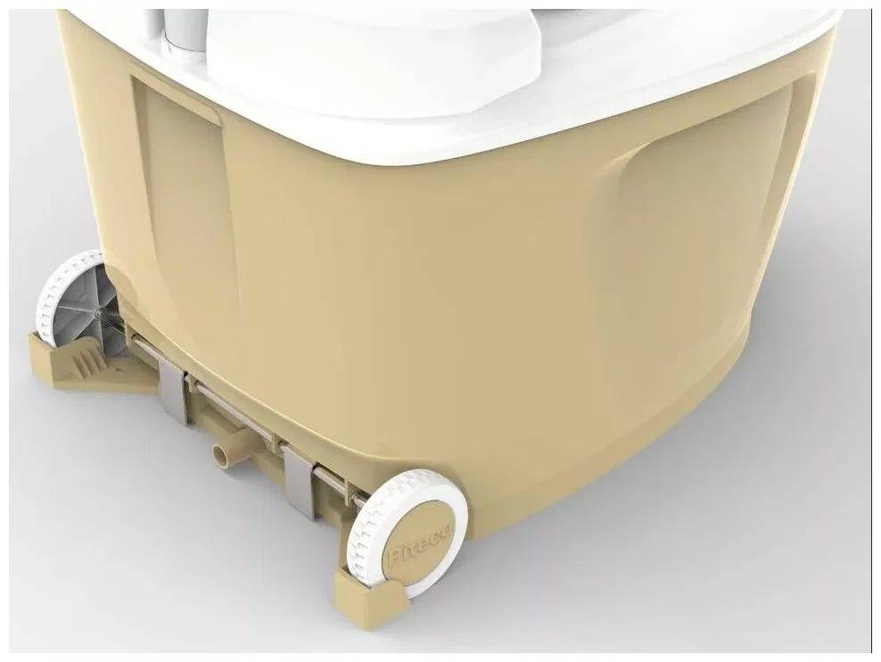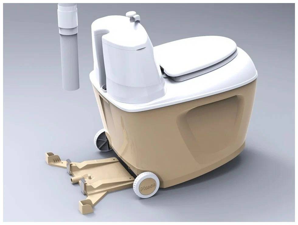 Габариты туалета составляют 59.5х82х80 см. Заявленная грузоподъемность – 150 кг. Устройство надежно крепится к полу. Для удобства перемещения туалета к месту установки предусмотрены транспортировочные колесики.