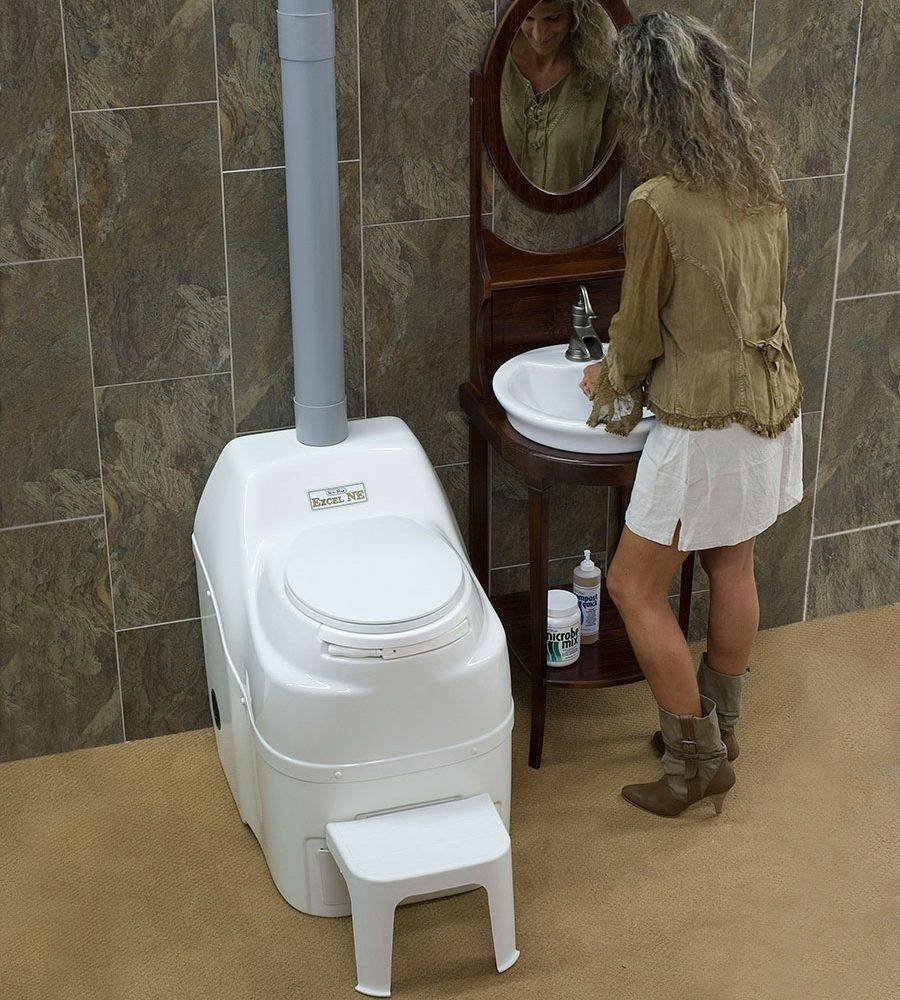 Электрический биотуалет для дачи без запаха – при покупке нужно продумать, как его подключить к сети. Построен по сложному принципу отделения твердых и жидких отходов с двумя баками для переработки.