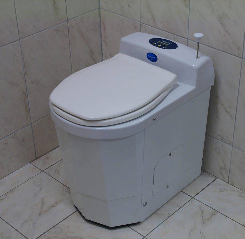 - Электрический биотуалет нуждается в наличие электрической сети, а принцип работы является более сложным по сравнению с предыдущими вариантами. В таких моделях происходит разделение «жидких» и «твердых» фракций, которые перераспределяются в разные резервуары. Удаление жидких отходов происходит по дренажным трубам, а твердые фракции проходят процесс высушивания и прессования компрессором.