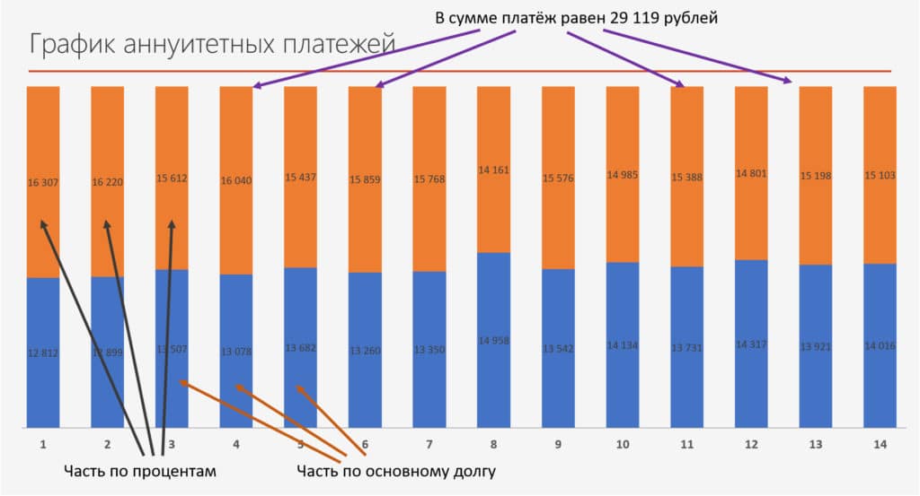 На графике отображены первые 14 платежей. Напомним, в сумме в нашем примере 120 платежей.