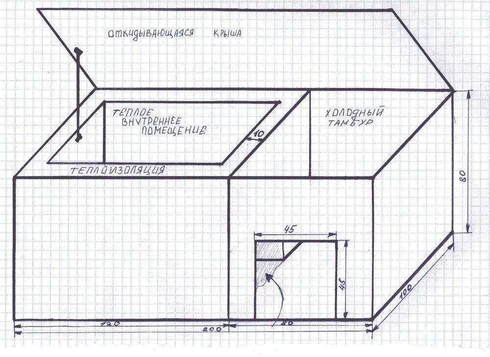 Вот зимняя будка, сделанная нашим участником с ником Shamilich. В будке два помещения: «зимник», размеры которого рассчитывались, исходя из размеров собаки, и тамбур.