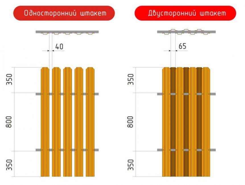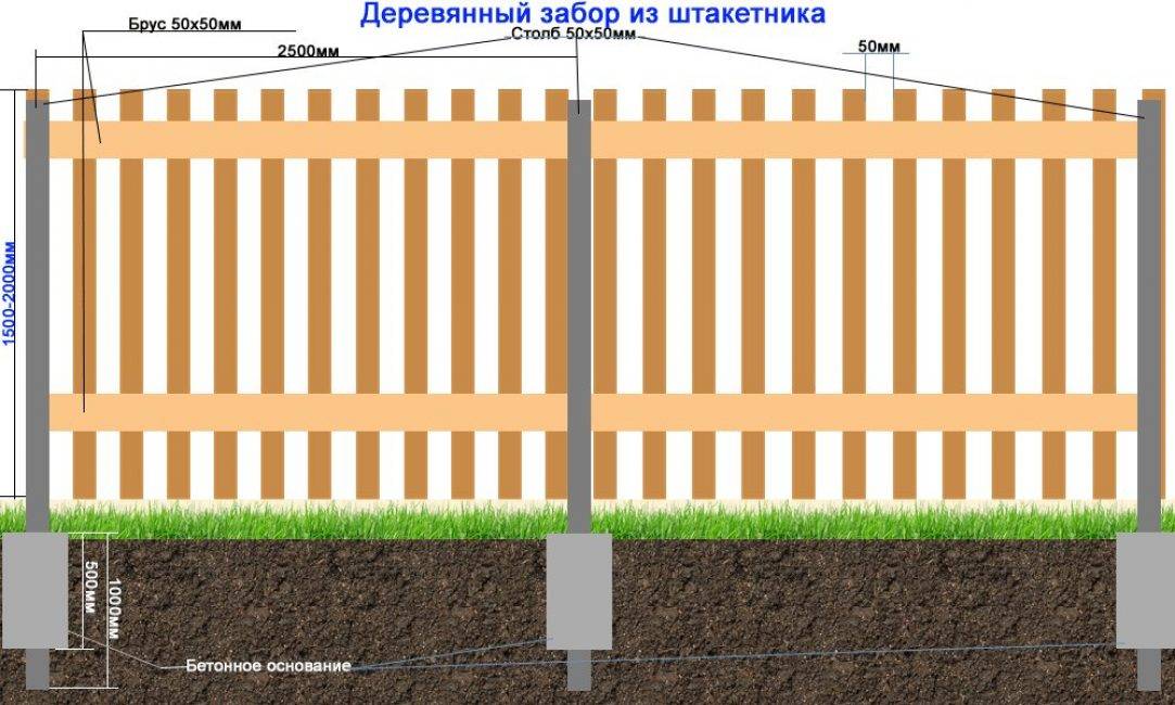 Стандартные размеры штакетника составляют 150 x 2 x 5 см. Однако используются и плиты других размеров. Наиболее устойчивыми к гниению являются изделия из лиственницы, ели, сосны или осины.