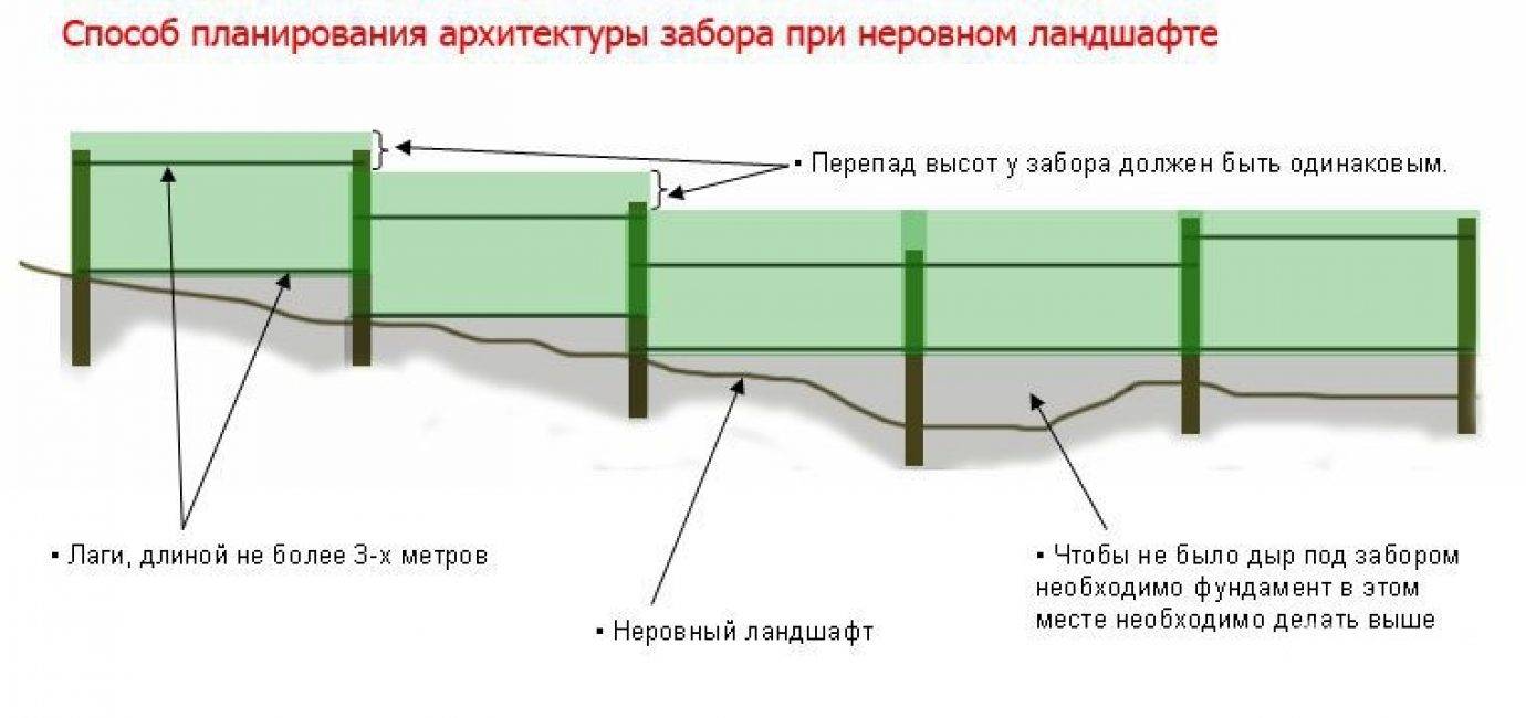 Иногда используется метод, при котором верхняя часть ограждения находится на одном уровне, а нижняя часть собирается из столбов ограждения разной высоты. Однако такие заборы выглядят менее эстетично.
