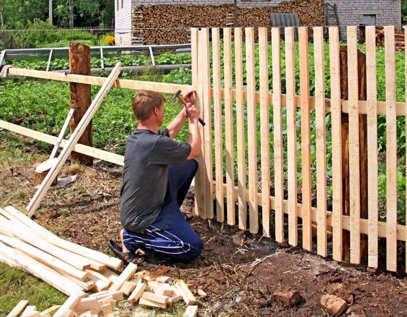 - Использовать подручные материалы, если планируется строить бюджетную деревянную изгородь. Можно брать не только штакетник, но и необрезную доску, остатки стройматериалов. В случае сооружения временной конструкции подойдет даже фасадная сетка, оставшаяся после наружной отделки дома.