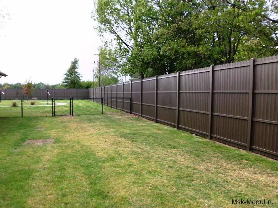 Если средств немного больше, то идеальным выбором станет возведение ограждения из профнастила. Это практично и прочно. Его цена будет выше, чем у всех рассмотренных ранее вариантов, но, по показателям долговечности и создаваемой приватности он превосходит их. Из минусов можно отметить: