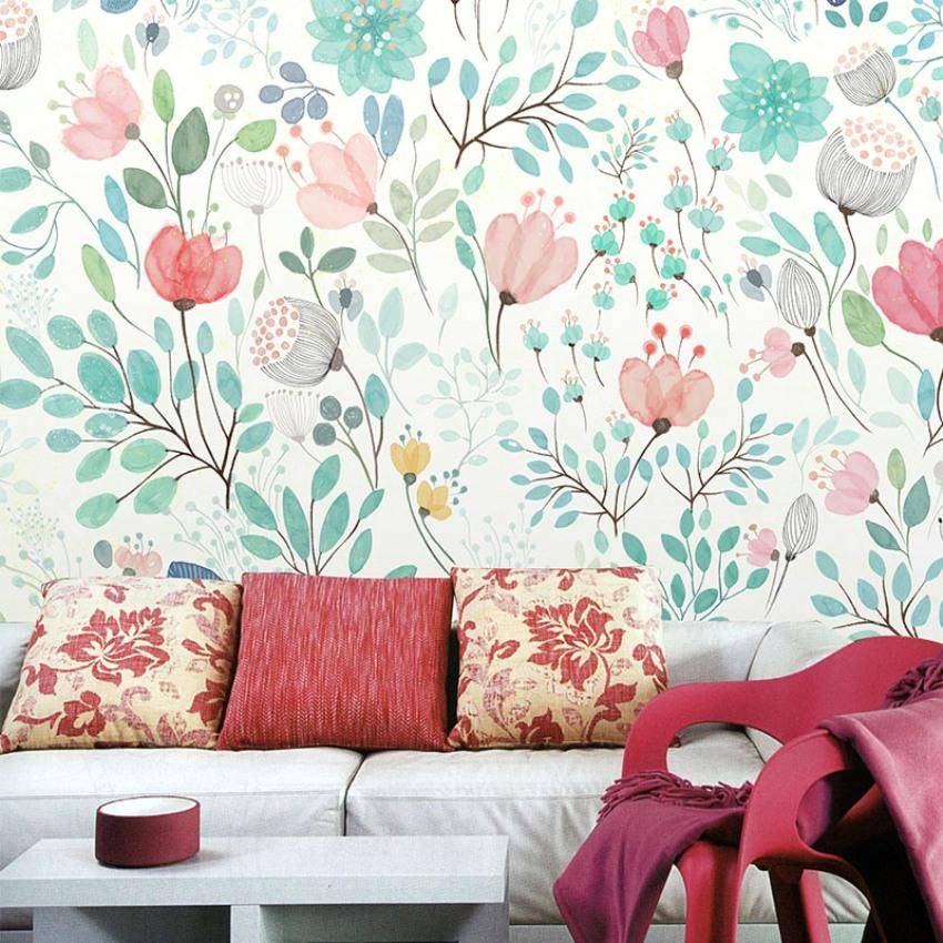 Мелкий цветочный узор прекрасно смотрится в небольших помещениях. Для гостиной также подойдут современные обои с крупными изображениями, которые образуют красочный орнамент. Ими лучше оклеить одну или две стены, но не всю комнату.