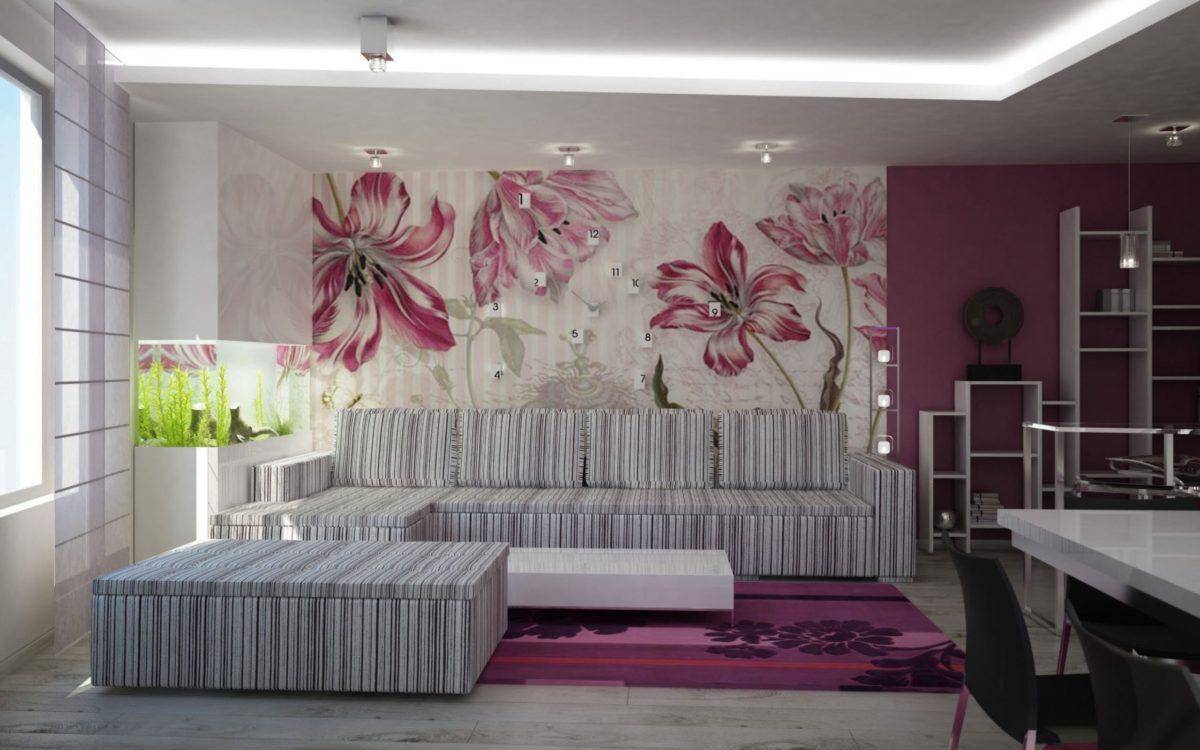 Цветочная тематика раскрыта на обоях в гостиной