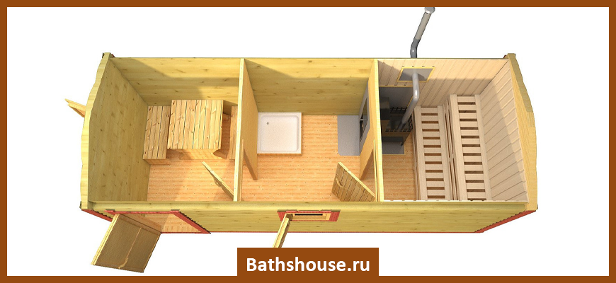 Стандартный вагончик имеет ширину 2,3 м. Установив перегородки внутри помещения, можно сделать тамбур и раздевалку, моечную и парилку. Если нужно сэкономить место, моечное отделение заменяют на душевую кабину, устанавливая ее в комнате отдыха. Тамбур нужен обязательно. В этом помещении можно хранить запас дров, зимой оставлять верхнюю одежду.