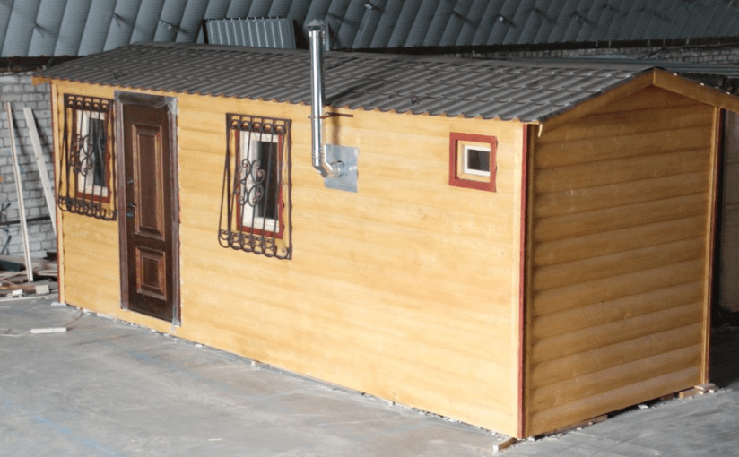 Щитовой вагончик представляет собой самый экономичный вариант. В основе постройки лежит каркас из бруса. Обшивка сделана из вагонки, внутри бытовку отделывают листами МДФ или ДСП. Для утепления используется стекловата или листы пенопласта. На перекрытия идет необрезная доска.