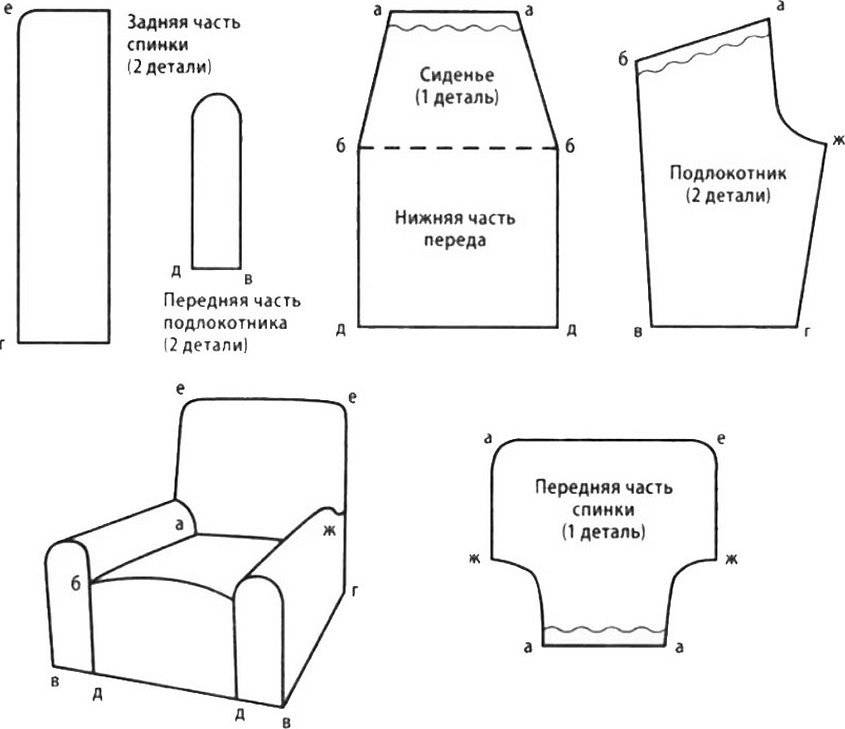 - По снятым меркам строится бумажная выкройка отдельно для каждой детали, кроме подлокотников, так как в этом случае вполне хватит одного лекала и его зеркального использования для противоположных сторон.