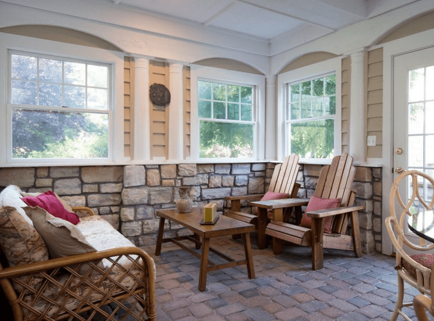 Также в этом помещении можно обустроить камин, который в дальнейшем послужит как агрегат для отапливания комнаты. Также на веранде есть одна капитальная стена, ее тоже необходимо оформить. Ее в основном красят однотонным цветом и иногда отделывают природными камнями. Чтобы крыльцо не выглядело пустым, его украшают полками для цветов, вазы, панно и различной формы светильники.