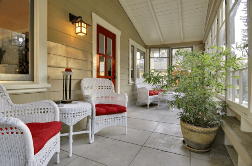 Это распространённый вариант, в котором основной задачей станет выбор правильного размера мебели. Важным моментом станет предпочтение в выборе дивана, ведь большой диван будет смотреться некрасиво на маленькой веранде, забирая всё её пространство, ровно также само, как диван маленького размера может просто затеряться в помещении.