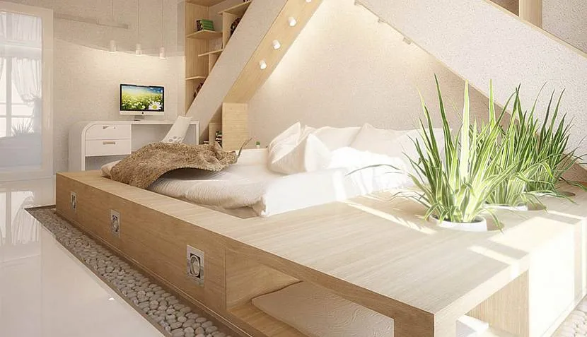 Экостиль в интерьере спальни – идеальный вариант для оформления помещения, предназначенного для отдыха и спокойного сна. Здесь можно поэкспериментировать: собрать основание кровати из упоминавшихся ранее европоддонов, использовать деревянные чурбаки в качестве мебели. Организовать пространство в изголовье кровати, украсив его панно, сделанным из деревянных спилов. Если эффект достигнутого будет положительным, можно переключаться на гостиную.
