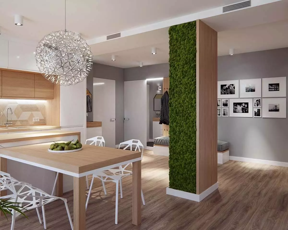 - Белый – классический нейтральный цвет, подходящий под любые стили. В случае с экологическим интерьером выступает как орнамент, на фоне которого намного эффектнее выглядят живые растения.