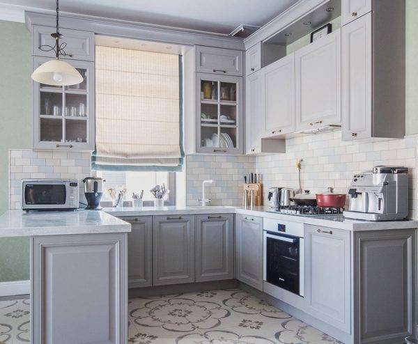 Белая состаренная мебель стиля прованс сочетается с фартуком из узорчатого кафеля. Производители керамической плитки выпускают коллекции в этом стиле. Всегда есть сочетаемые оттенки и рисунки. Для фартука можно использовать несколько видов плитки: снизу и сверху кайма с орнаментом, затем однотонные ряды и полоса с пейзажем или натюрмортом. Рисунок может быть простым или вычурным. Кафель с орнаментом – один из элементов, образующих стиль прованс.