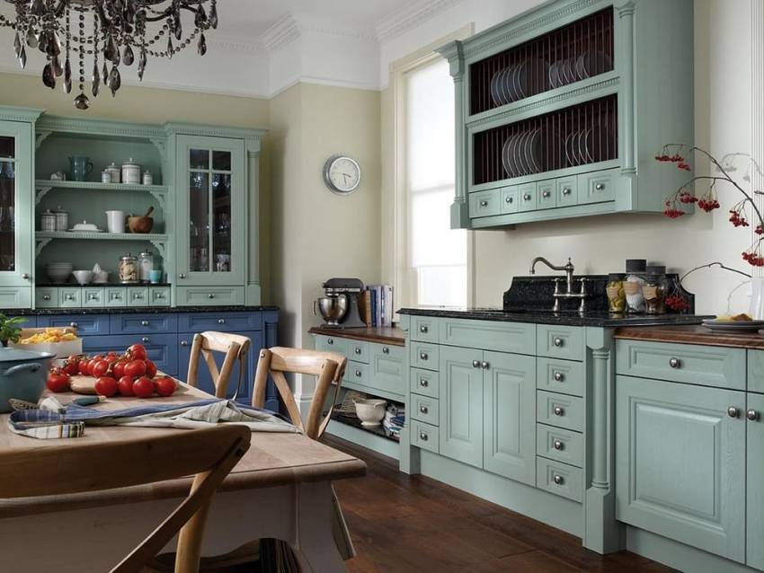 На фото кухня в стиле прованс, окна которой выходят на солнечную сторону. В жаркие дни приглушенный зеленый цвет привносит в обстановку свежести.