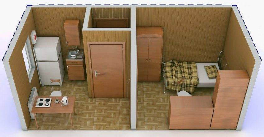 Самые жаркие дискуссии разворачиваются вокруг наилучшего распределения пространства бытовки. Планировка жилого блока ограничена общей площадью, а потому для минималистских боксов (3х2,3 метра) единственный возможный вариант планировки – это пространство без перегородок. Более широкие помещения подразделяются на вагончики с одной комнатой и служебными секциями (тамбур, санузел, хозблок) и такие же бытовки, но уже с верандой или крыльцом.