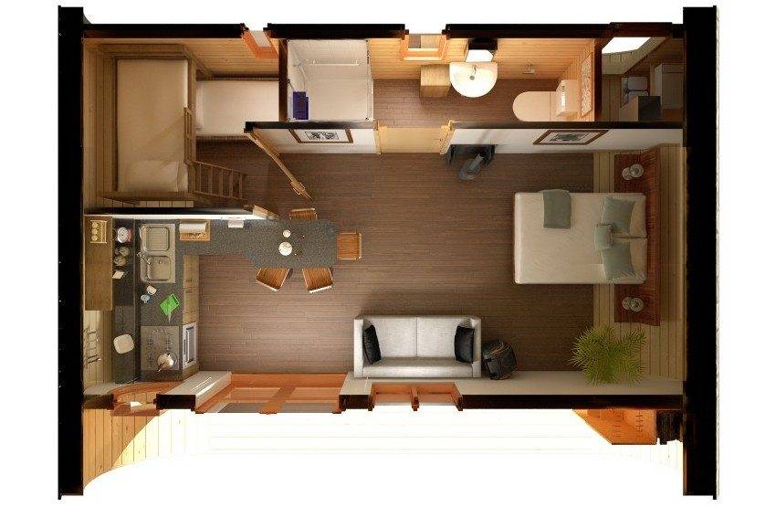 В современных городских домах на такой площади располагается однокомнатная квартира с кухней и санузлом. Примерно такую же планировку можно применить и при строительстве дачного домика.