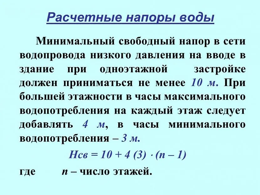 Формула расчета минимального располагаемого напора водыИсточник Eurobion.info