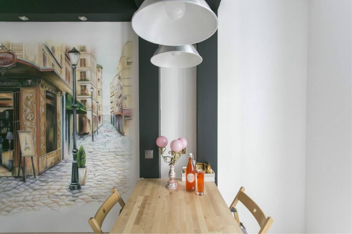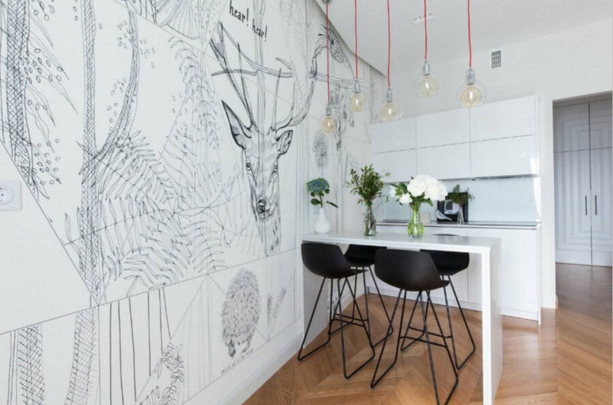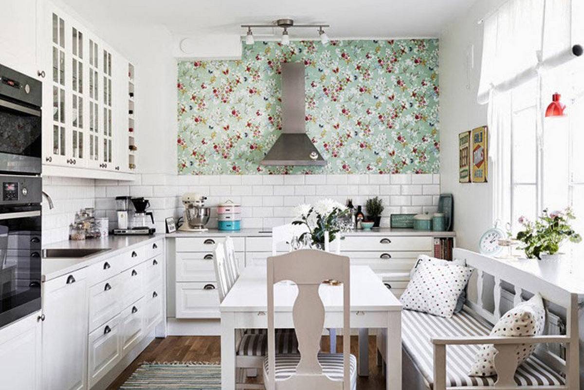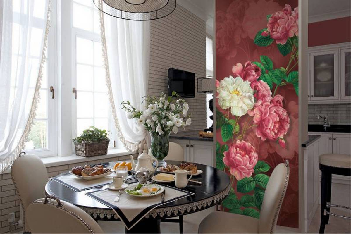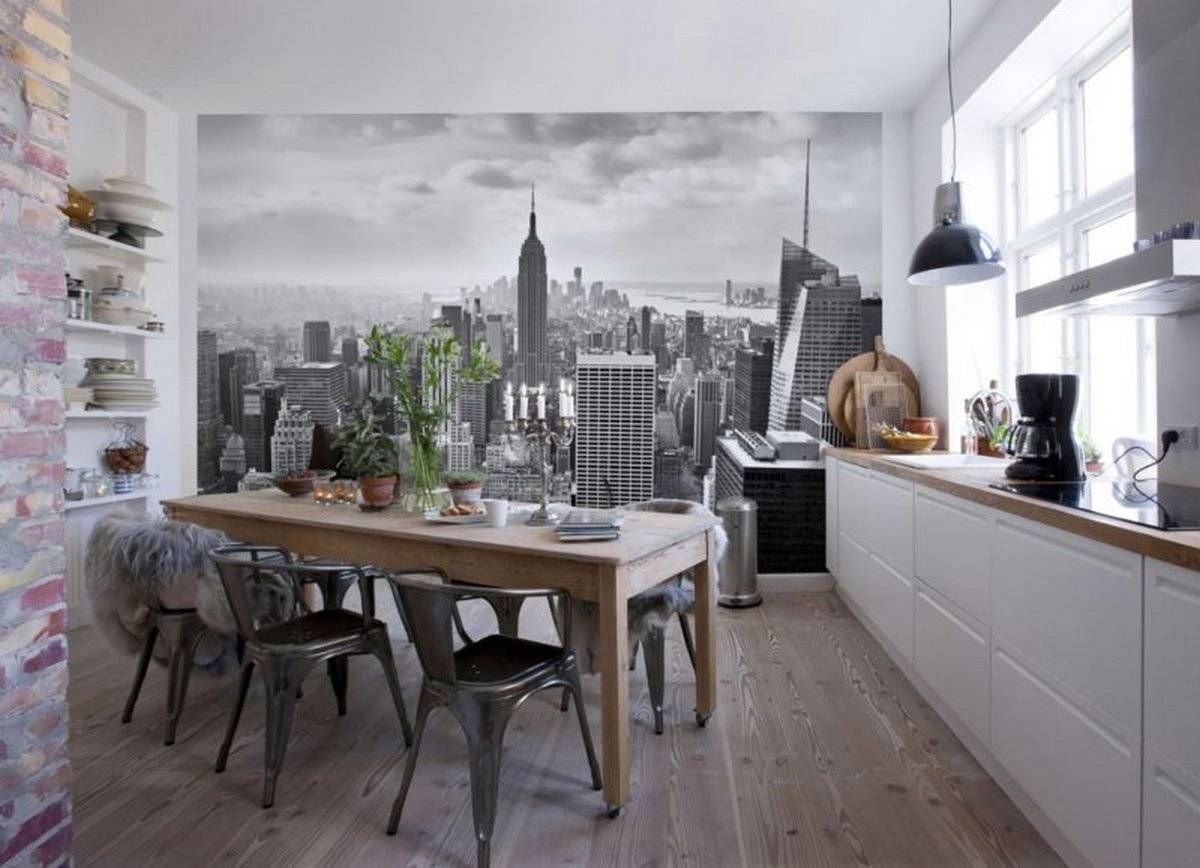 - Обои. Если все стены на кухне окрашены, то для обеденной зоны можно выбрать обои с интересным принтом. Особенно органично смотрятся фотообои.