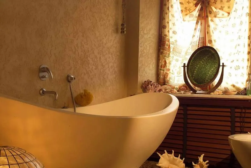 Марокканская штукатурка используется на востоке для оформления поверхностей, контактирующих с влагой внутри дворцов. Идеально подходит в качестве финишной отделки стен в ванной или туалете. Техника нанесения состава трудоемка и требует навыков, потому дорогостоящая, как и сам материал.
