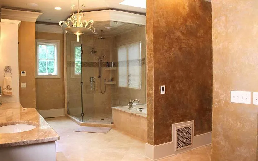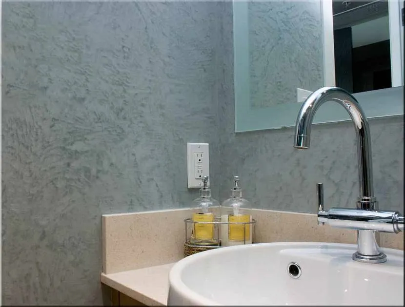 Особенность фактурной отделочной смеси — нежная консистенция и тонкозернистость, кроме того, с ней удобно работать. Примером для отделки в ванной служит венецианка или марокканка, используемая для тонкослойной отделки.