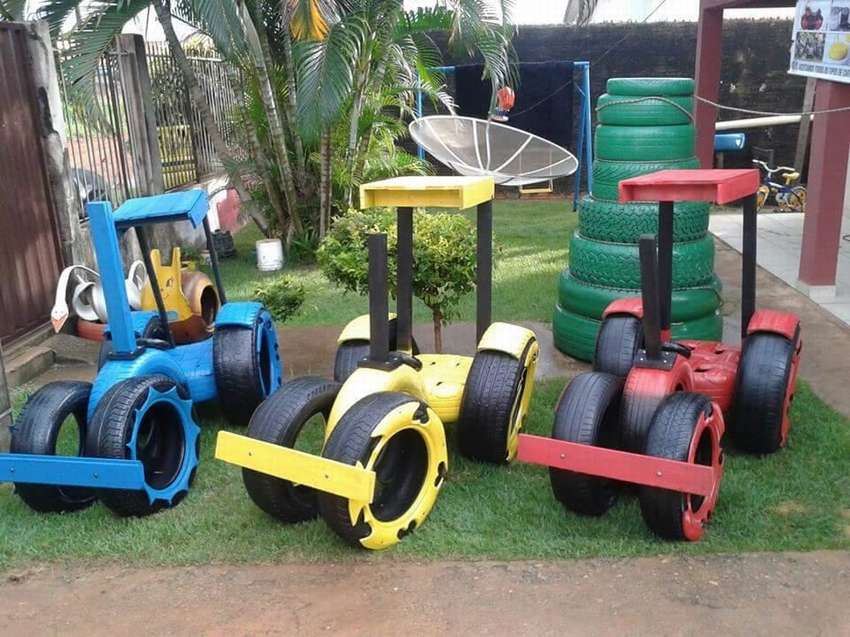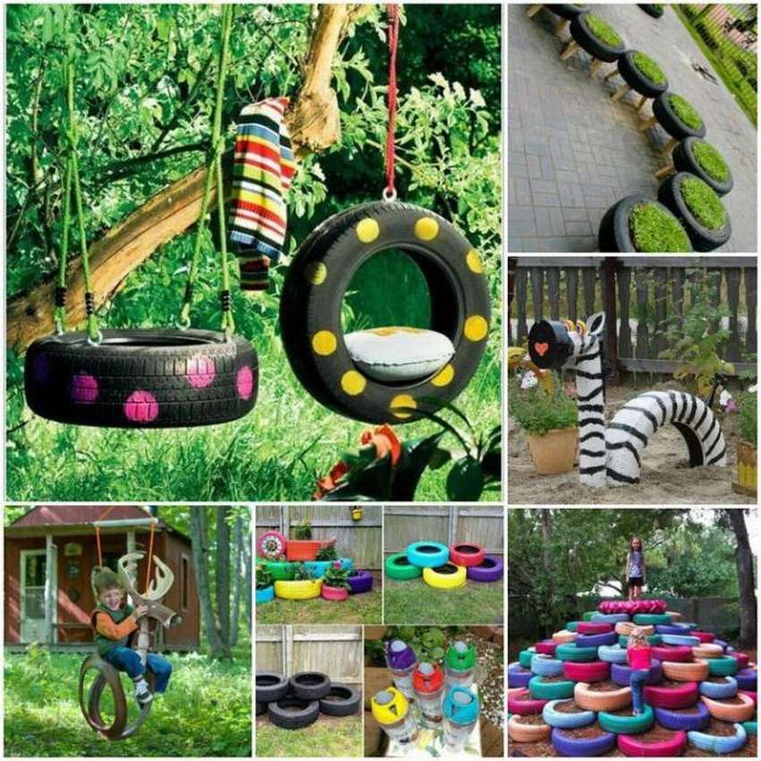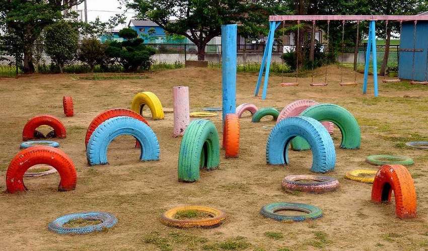 Если детская площадка будет делаться из покрышек, на ней могут быть качели, привязанные к деревьям, клумбы, фигуры животных и даже горки.